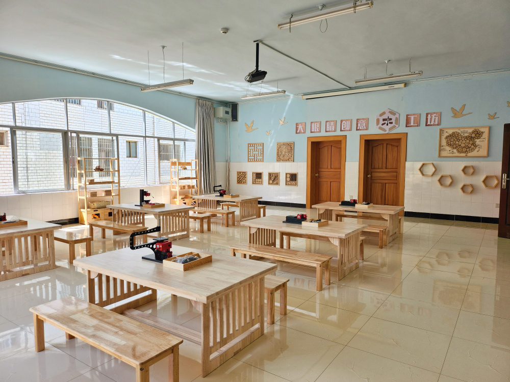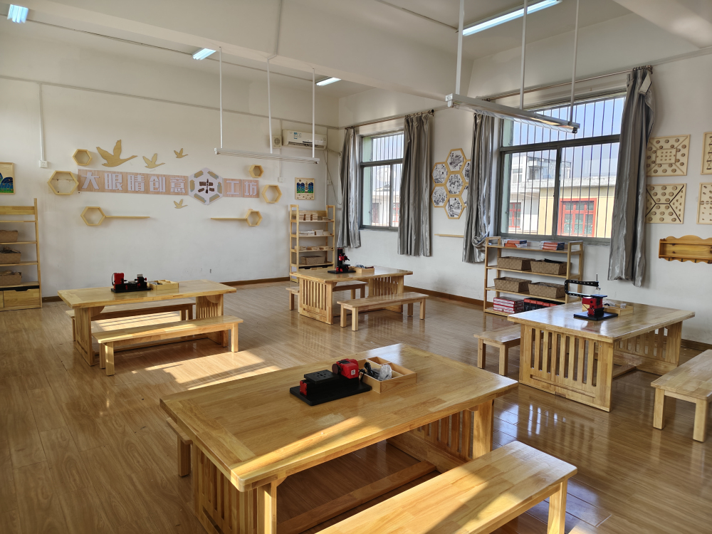 大眼睛创意木工坊,专为3-6岁幼儿设计,全系列工具耗材通过幼儿安全认证,配套一系列实木专用家具。提供分龄课程+一站式安装培训服务,让孩子在安全、趣味的木艺创作中,培养耐心、创造力与工匠精神。目前已落地全国1200+幼儿园。